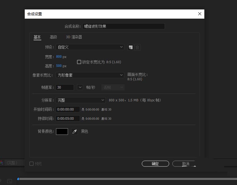 1、打开AE软件,命名螺旋波形效果,调整相应的参数。