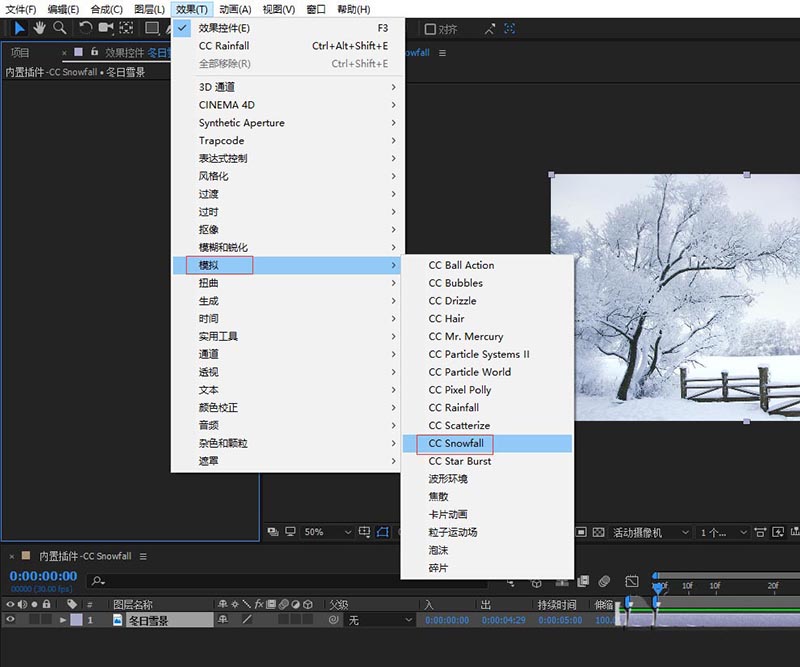 3、选中背景素材添加CC Snowfall,效果-模拟-CC Snowfall;