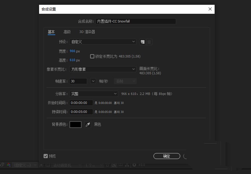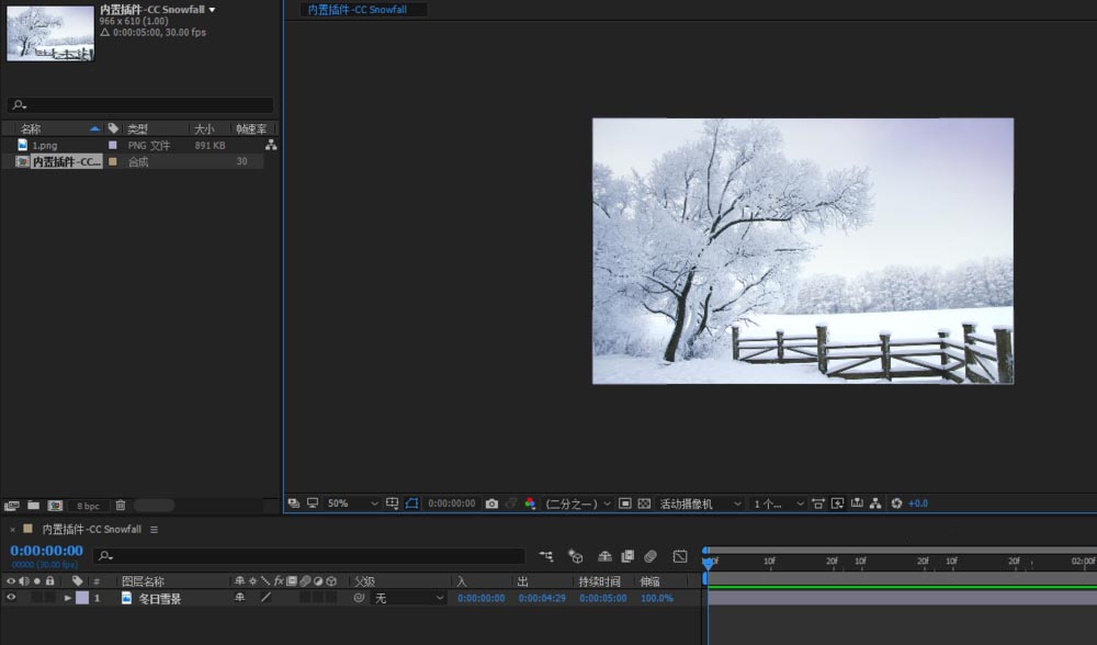1、打开AE软件,命名内置插件-CC Snowfall,调整相应的参数。