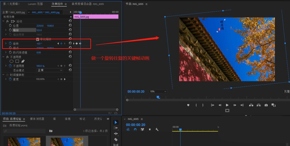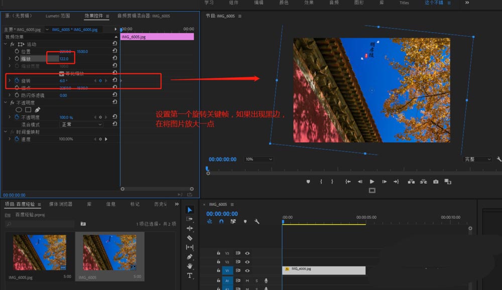 3、将时间轴指针移到最开始位置,然后在旋转上打入第一个关键帧,并设置旋转角度为6度,如果画面有黑边出现,我们还需要通过缩放来进一步放大画面到黑边消失。