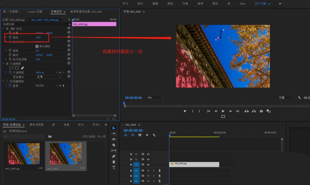 2、选中时间轴视频轨道中的素材对象,在效果控件窗口中找到缩放设置,将其放大一点。