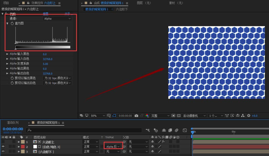 5、选中六边形上层预合成添加色阶,通道类型选择Alpha把它拖到不透明;然后白色纯色层Alpha反遮罩六边形上层预合成;