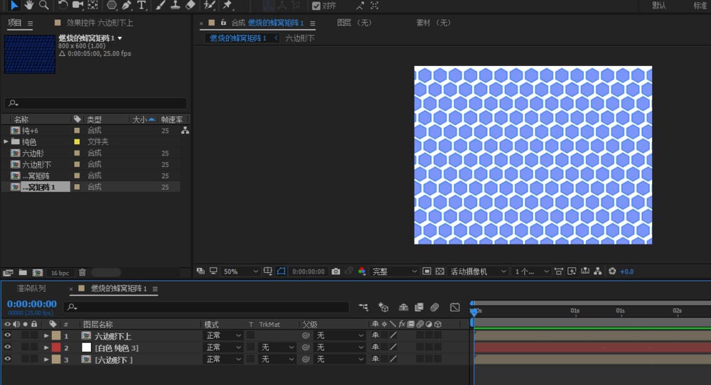 4、将六边形ctrl+shift+c预合成,然后ctrl+y新建一个白色纯色层,选中预合成ctrl+d复制一个预合成,然后将白色纯色层放置两个预合成中间;