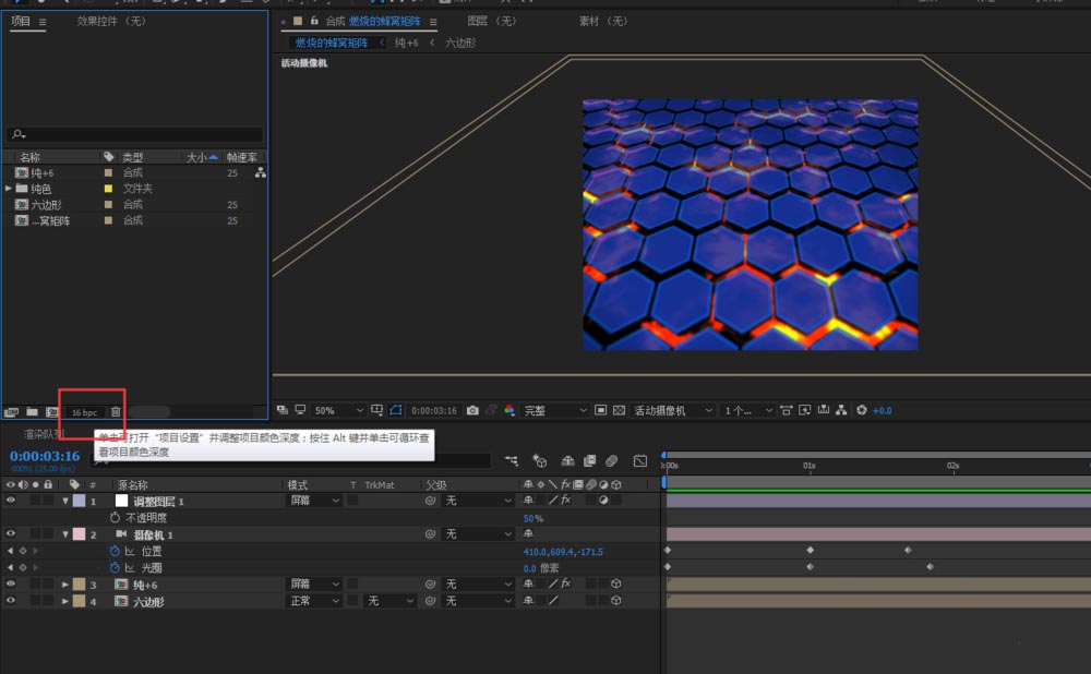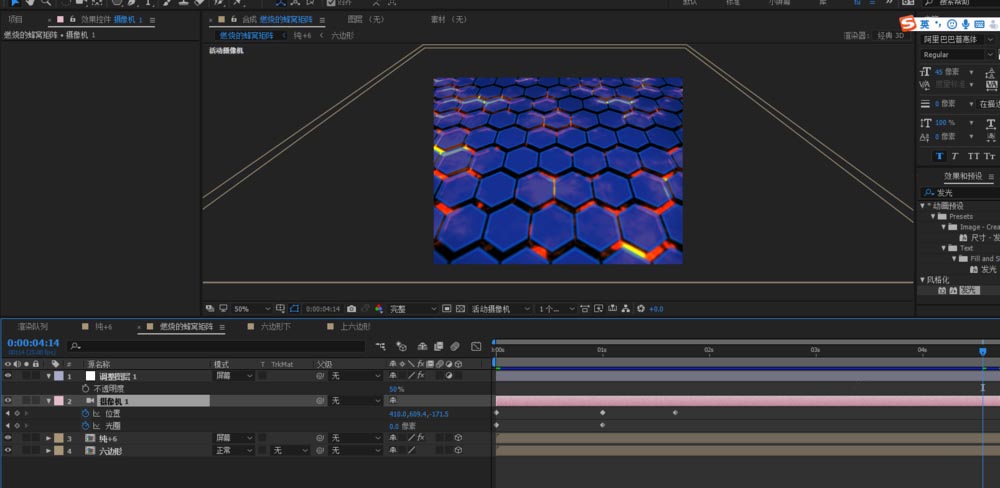 9、打开两个预合成的3d模式,新建一个摄像机,给摄像机的位置和光圈k关键帧实现一个镜头移动的动画效果;将上面一层的六边形往上提一点,给人感觉有点厚度;