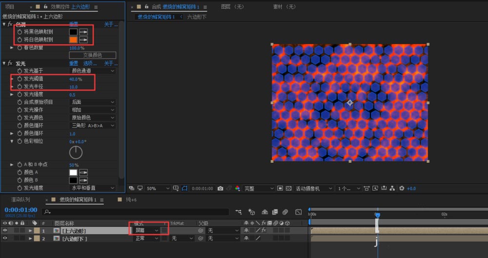7、将六边形预合成上和白色纯色层选中ctrl+shift+c预合成,命名为上六边形;添加Tint色调将黑色替换成火的橙色,然后添加发光效果,提高发光亮度,如果不够的话,可以再复制一层发光效果层;再把上六边形预合成模式改成屏幕;