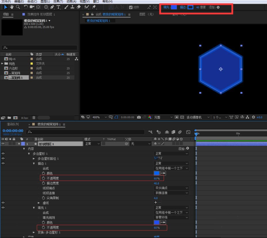 2、选择多边形工具绘制一个多边形,然后设置点数为6,形成六边形,设置填充颜色和描边颜色,不透明度分别设置为60%;