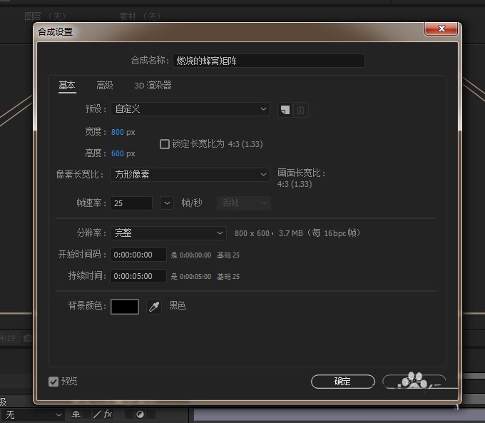 1、打开AE软件,新建合成,命名燃烧的蜂窝矩阵,调整相应的参数。