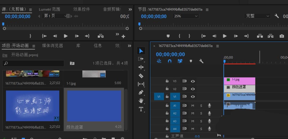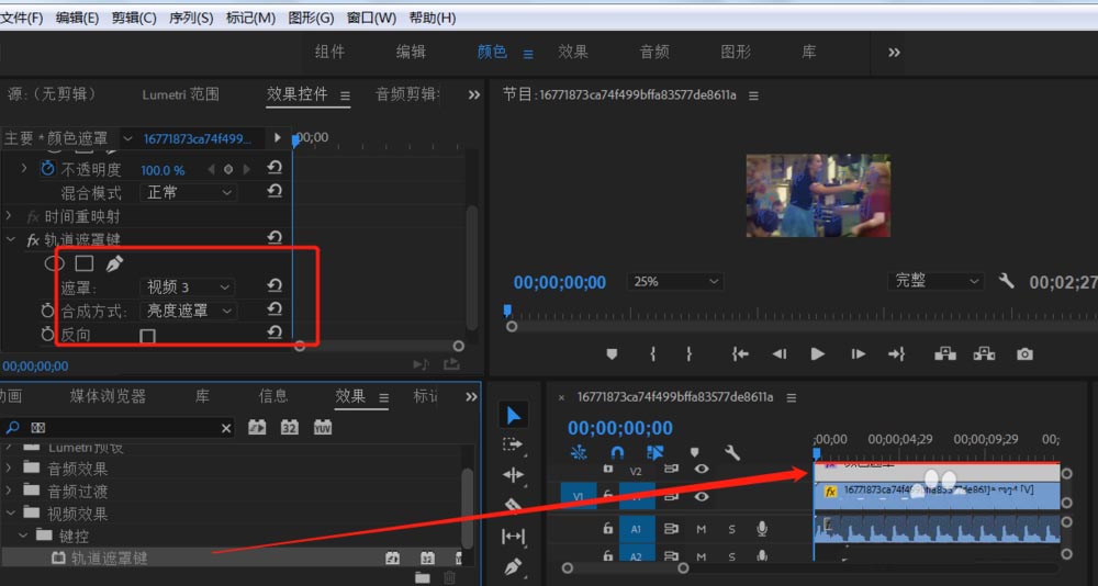 5、将颜色遮罩推至手写文字下一层,并将“轨道遮罩键”应用到颜色遮罩中,在效果控件中选择遮罩为“视频3”合成方式为“亮度遮罩”