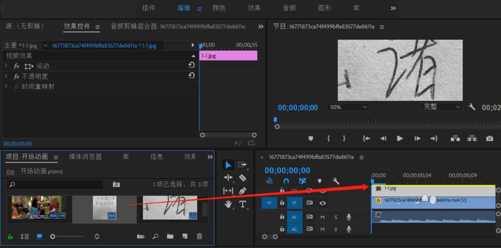 1、打开premiere将视频素材和手写照片导入到时间轨道中,将手写照片放置到视频上一层,并调节照片大小