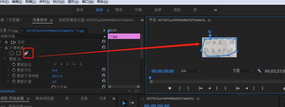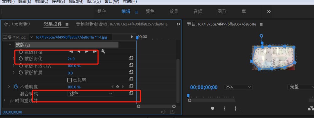 2、在效果控件中找到不透明度中的钢笔工具,在照片中画蒙版并调节蒙版羽化,接着将不透明度中的混合模式修改为“滤色”