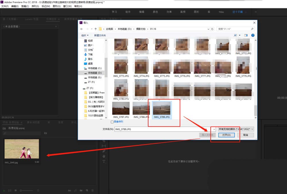 1、在PR项目中执行快捷键Ctrl+I弹出导入窗口,找到素材媒体文件路径,选择两个不同素材媒体导入到PR。