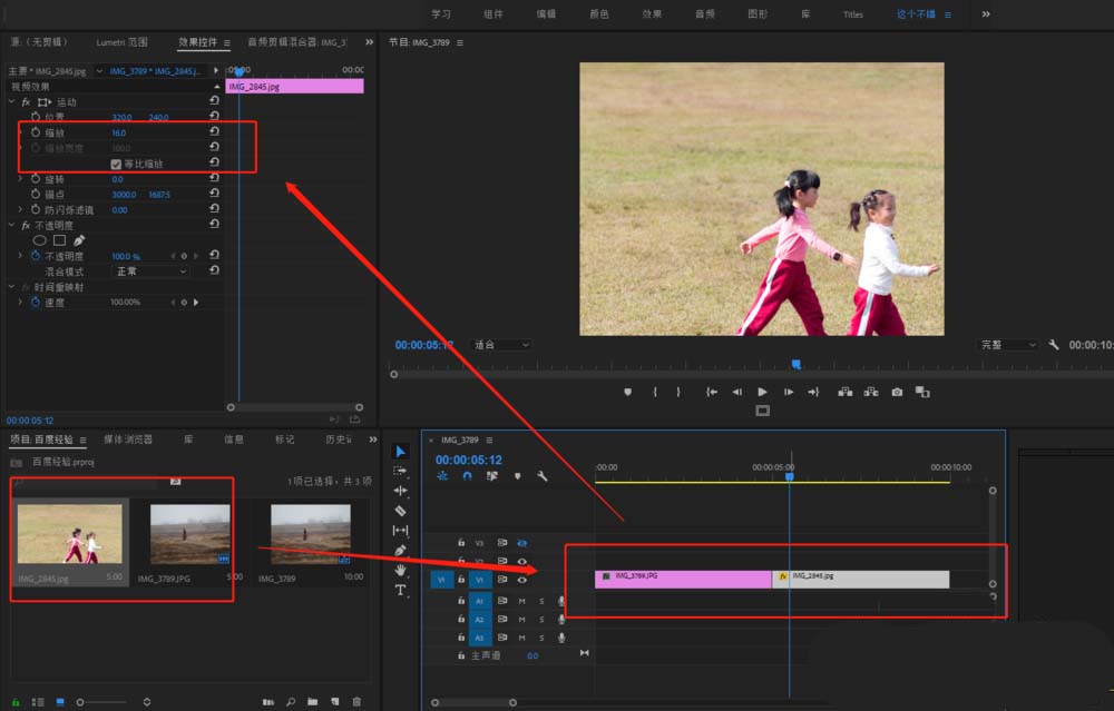2、再来创建一个序列,将两个导入的媒体素材拖到序列的视频轨道中,调整其大小缩放。