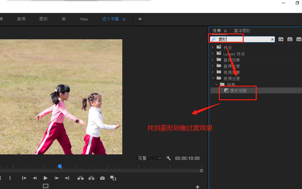 3、打开“效果”窗口或切换到效果界面,搜索关键字找到“菱形划像”这个视频过渡效果。