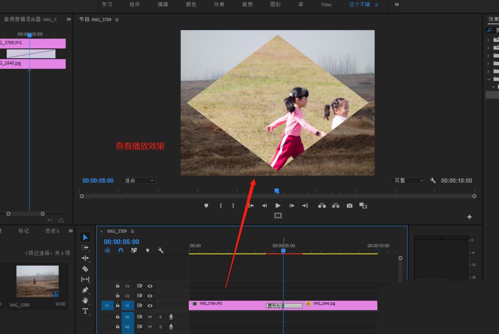6、对菱形划像的设置都完成之后,在点击播放按钮来播放这个过渡效果,一个以菱形图形进行视频过渡的效果就完成了。
