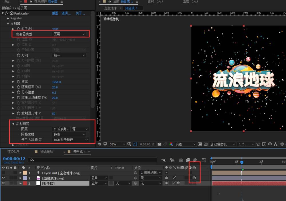 3、ctrl+y新建一个纯色层命名为粒子层,并添加Particular粒子插件效果;调整相应的参数,将发射器的类型选择为图层,将发射图层选择为素材图片(前提得打开素材图片的3D开关);