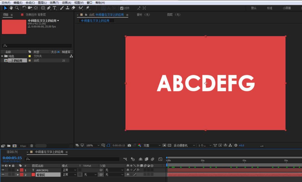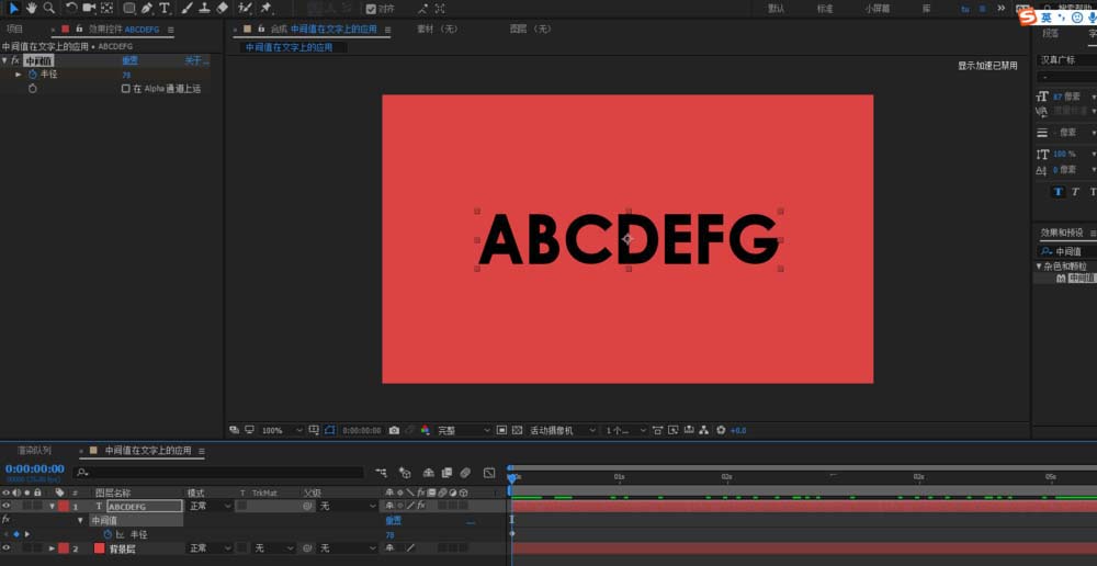 1、打开AE软件,命名中间值在文字上的应用,调整相应的参数。