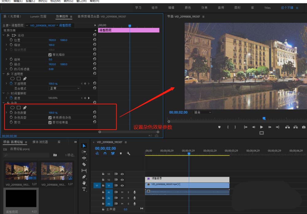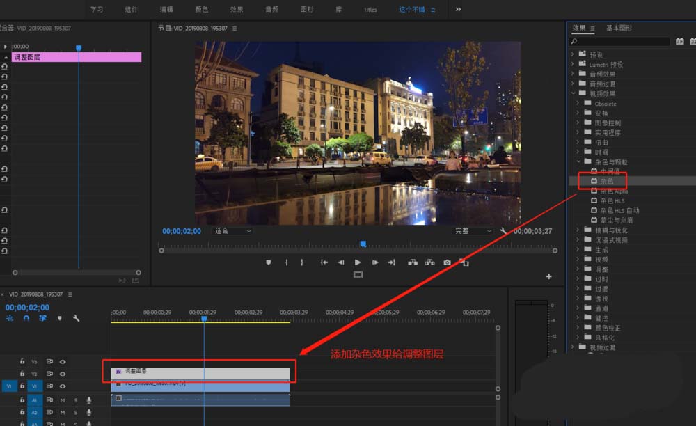 4、打开效果窗口,在效果窗口中找到视频效果中的“杂色”这一个视频效果,将这个杂色的视频效果拖到调整图层上松开鼠标。