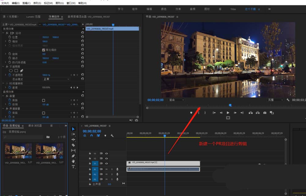 1、新建一个PR序列,然后执行导入文件命令,导入视频文件,将视频文件拖入序列的视频轨道。