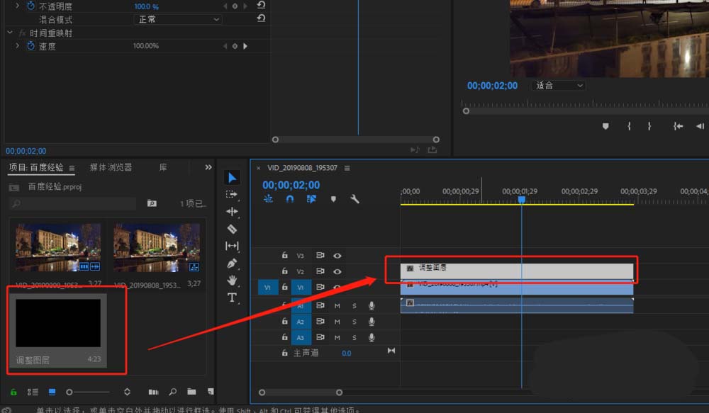 3、在PR项目素材媒体管理窗口中找到新建的调整图层,将这个新建的调整图层拖到序列的视频轨道2上面。