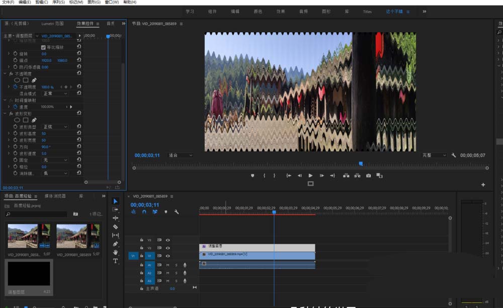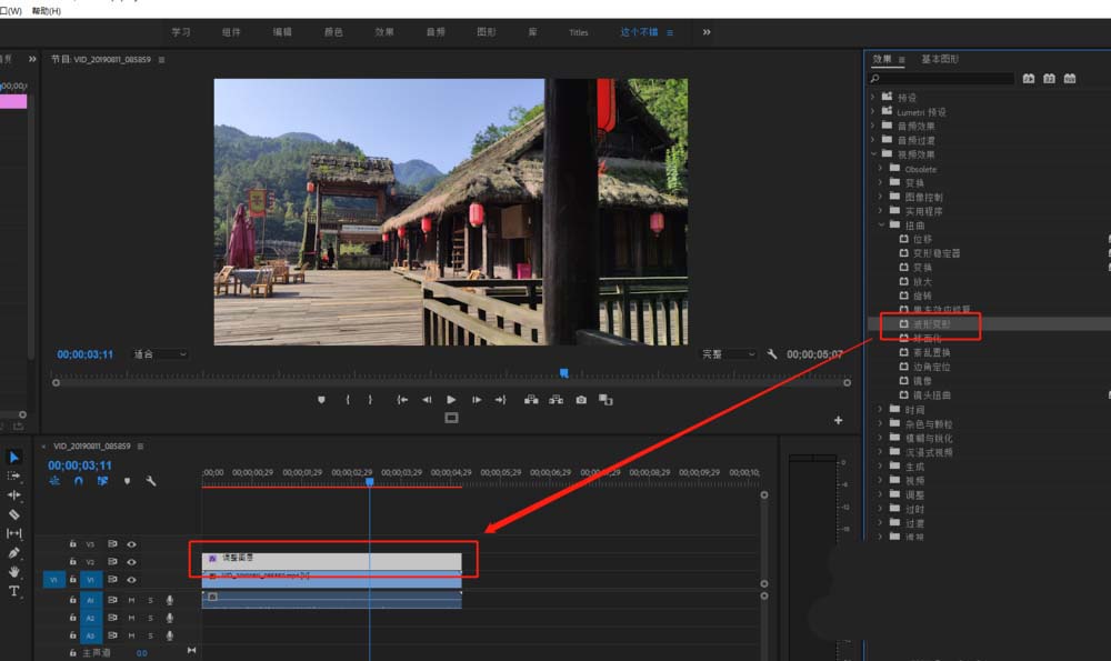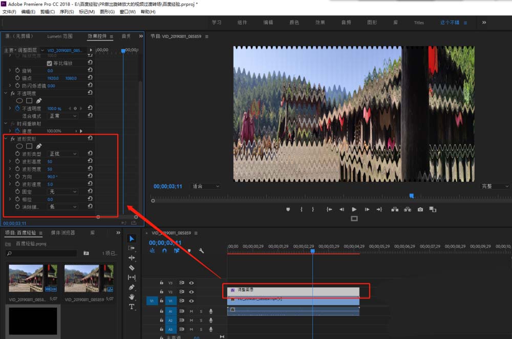 4、在效果窗口中搜索关键字或者直接找到视频效果中的波形变形效果,将这个效果拖到调整图层上。