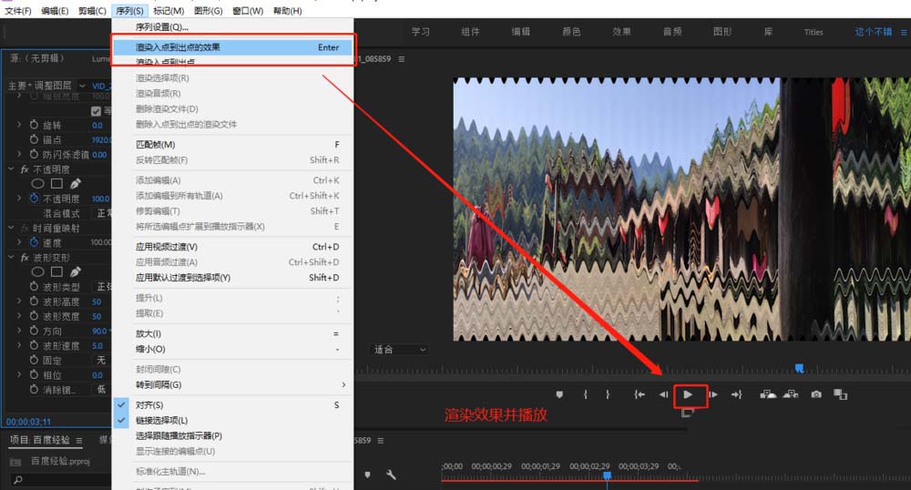 6、执行渲染入点到出点的效果,渲染完成之后播放时间轴查看效果,一个波形变形的动态动画效果就出现了。