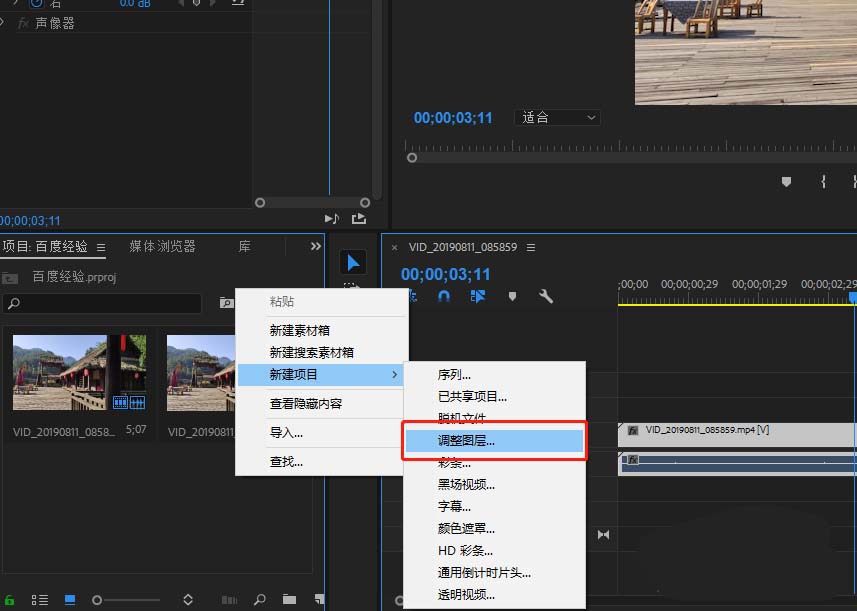 2、在PR剪辑项目窗口空白处单击鼠标右键,在出现的鼠标右键选项中执行新建中的调整图层选项。