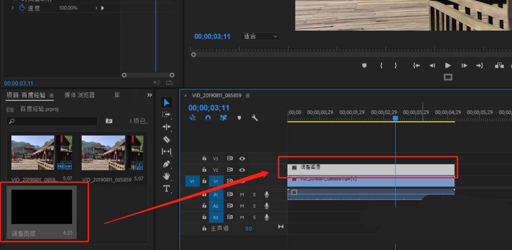 3、选择项目窗口中新建的调整图层,将这个新建的调整图层选中并拖到序列的视频轨道2,调整时间长度。