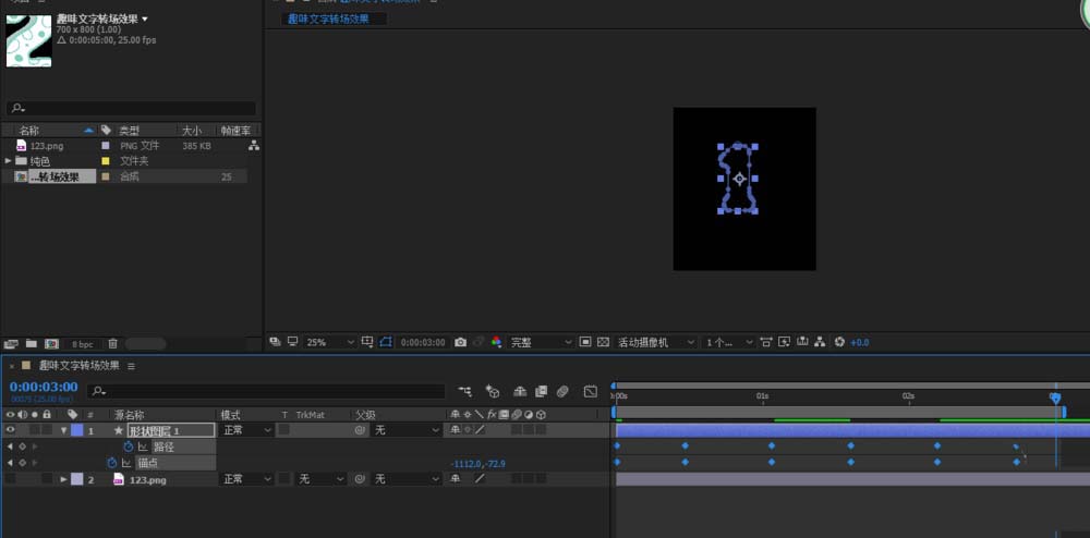 5、然后把对应三个数字的路径复制到形状图层下面的路径坐位关键帧出现;调整锚点位置,对好位;