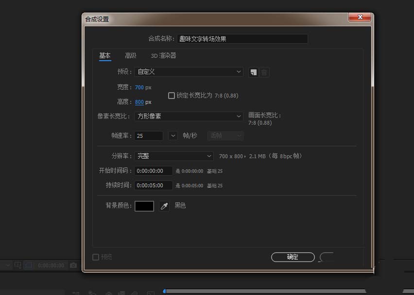1、打开AE软件,命名打开AE软件,命名趣味文字转场效果,调整相应的参数。