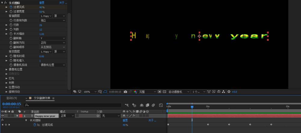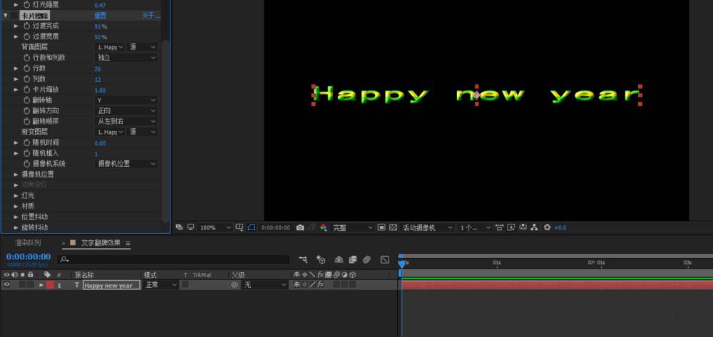 4、选中文本图层,继续添加卡片擦除效果;效果-过渡-卡片擦除;