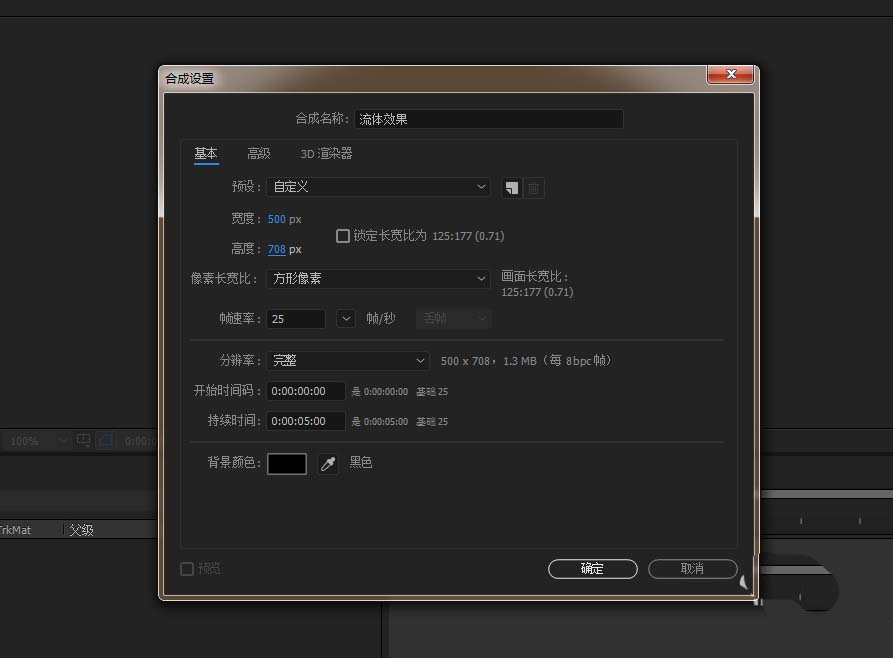 1、打开AE软件,新建合成,命名流体效果,调整相应的参数。