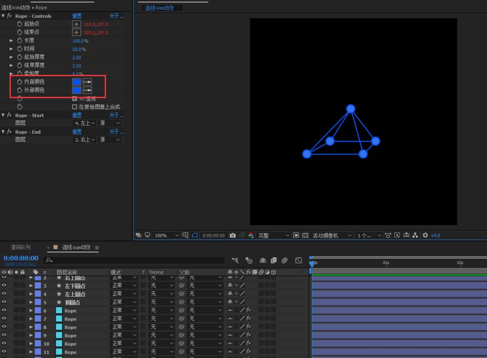 4、然后选中要连接的圆点,点击Motion2插件的ROPE功能;可以修改连接线的颜色;