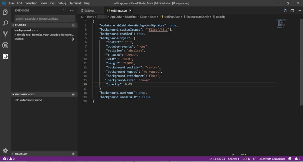 6、这个时候就可以设置背景的样式了,格式和CSS的类似,这里重要的是图片的地址。"background.customImages":。路径不要写错了。