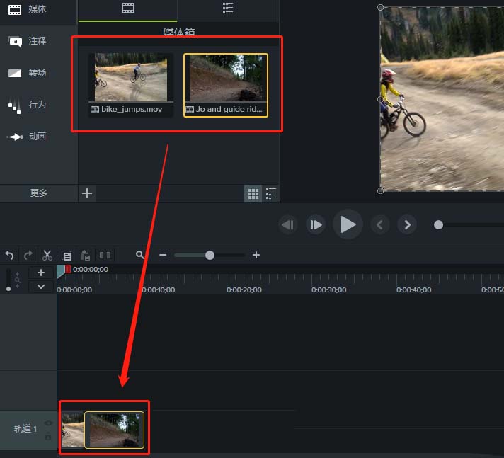 3、先选中一个媒体素材拖到时间轴轨道1,在选中另一个媒体素材拖到同一时间轴轨道前一媒体素材的后面。