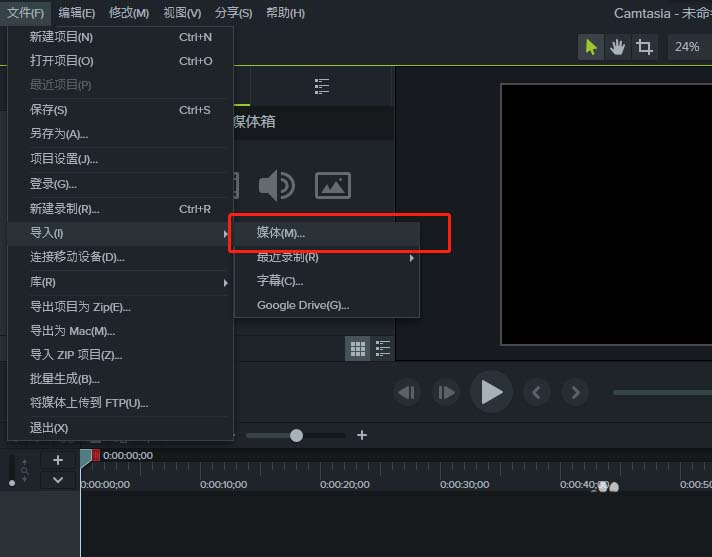 1、创建一个空Camtasia 9项目,选择执行文件菜单的导入,执行导入媒体。