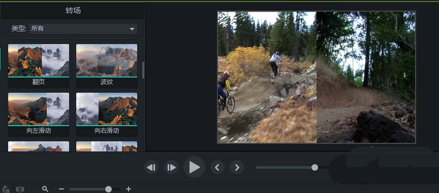 6、添加了向左滑动的转场之后,播放时间轴,当时间轴播放到两个视频之间的转场的时候,就会出现向左滑动的效果了。
