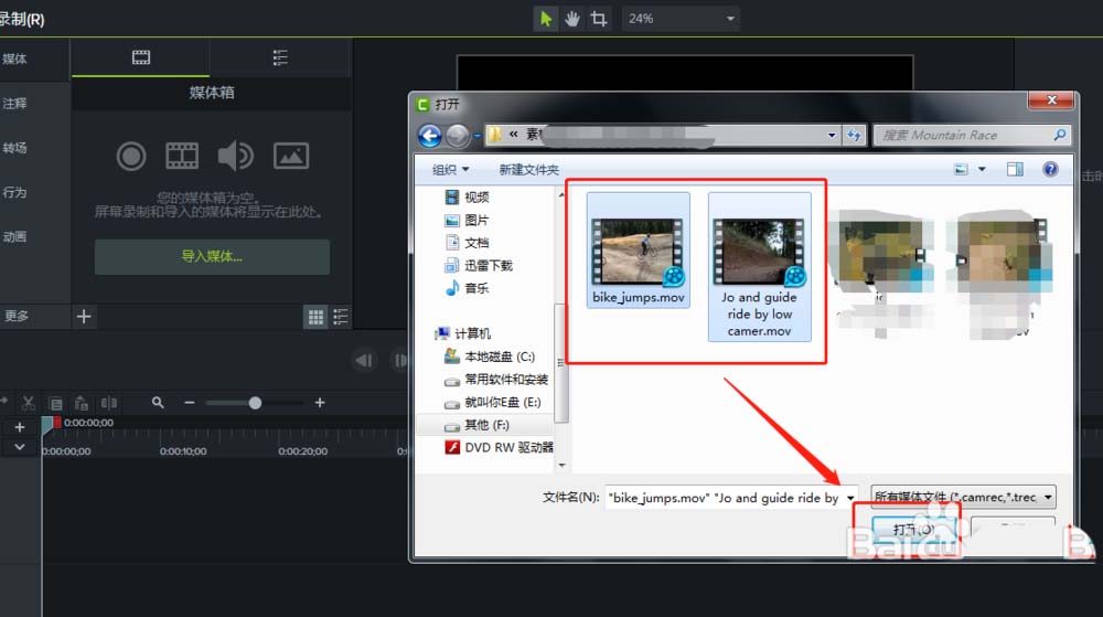 2、弹出“打开”窗口,在打开窗口中找到媒体素材存放的电脑路径位置,然后选择两个媒体素材导入到Camtasia 9项目中。