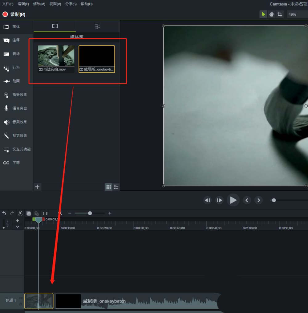 3、选中两个视频媒体,将这两个视频媒体拖动到时间轴轨道中。