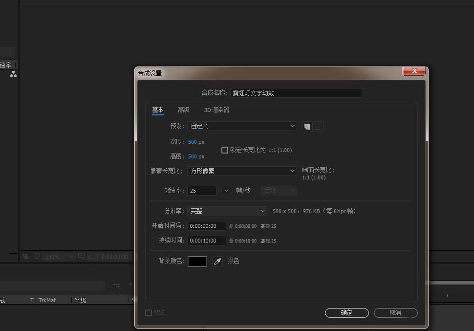 1、打开AE软件,新建合成,命名霓虹灯文字动效,调整相应的参数。