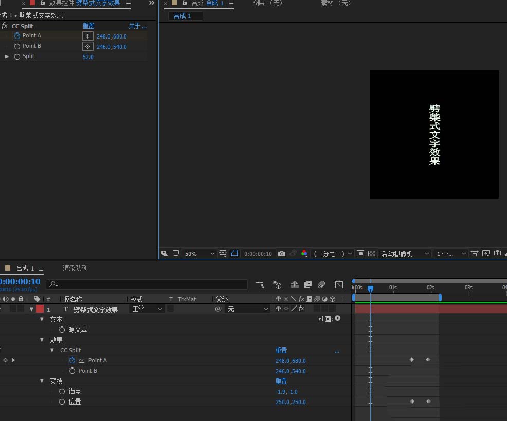 3、选中文本图层,添加CC Split效果;效果-扭曲-CC Split;