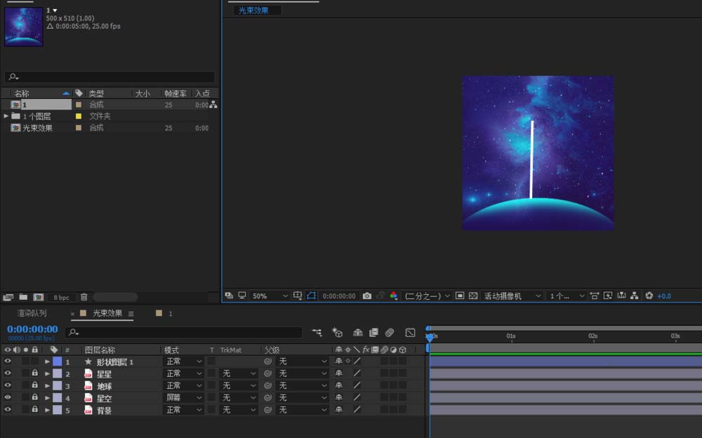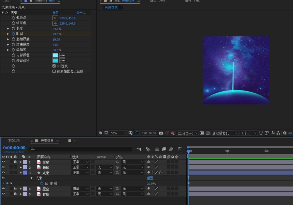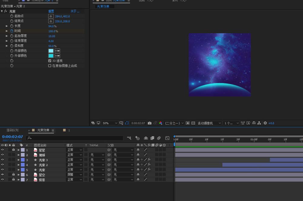 6、调节光束的起始点和结束点,调节光束的长度和颜色等信息,给时间属性K关键帧;开始为原始值,结束为100%,实现一个光从地球发射到宇宙的一个过程;