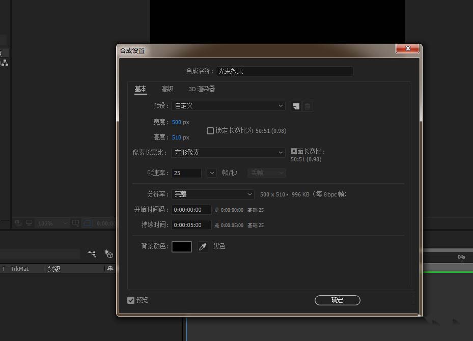 1、打开AE软件,新建合成,命名束效果,调整相应的参数。