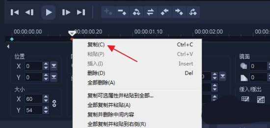 8、我们点击粘贴就行了。我们就成功的在结束帧的位置进行了复制。在结束帧的位置上,我们也就能够看见X轴为60,Y轴为54了。就这样,我们就复制了关键帧。