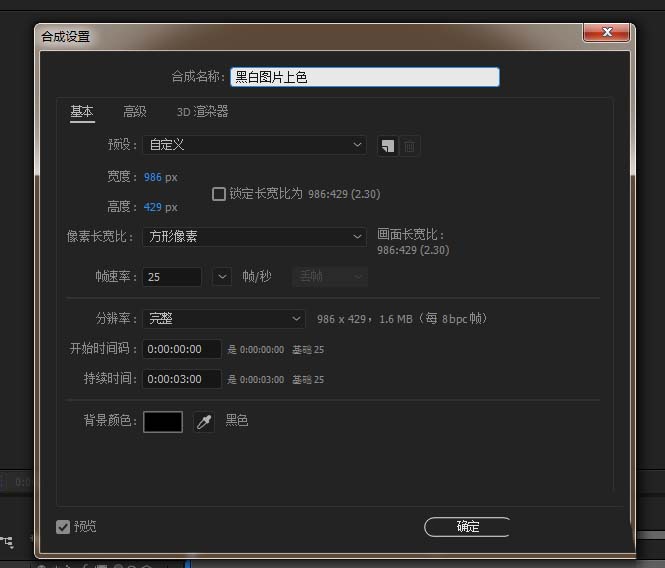 1、打开AE软件,新建合成,命名黑白图片上色,调整相应的参数。