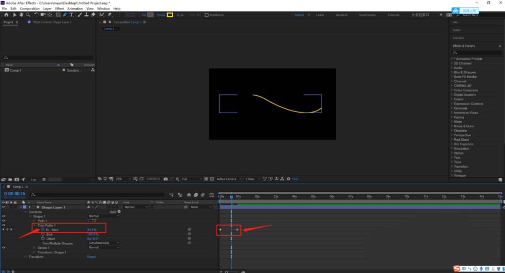 6、打开trim paths,调整start和end参数,就可以看到线条已经有生长的动画了