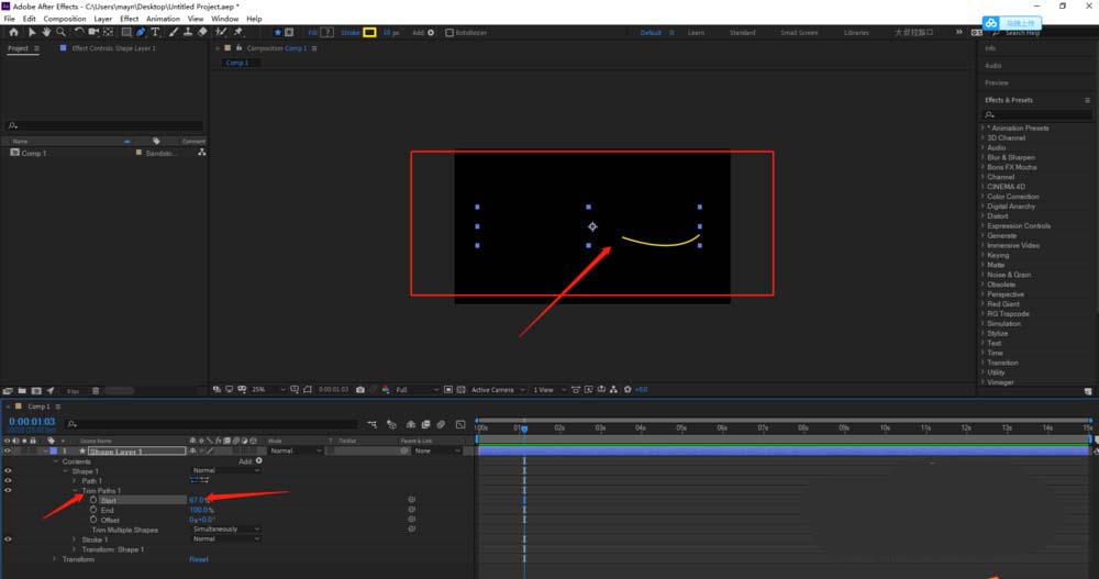 7、根据自己动画的需要,设置合适的关键帧,例如。可以在开始位置设置start的关键帧,数值为100%;在结束位置设置start关键帧,数值为0%。