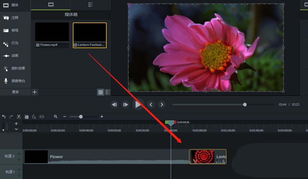 3、先选择一个视频素材将其拖到时间轴的轨道2,然后在选择另一个视频素材也拖到时间轴的轨道2,放在第一个素材的后面。