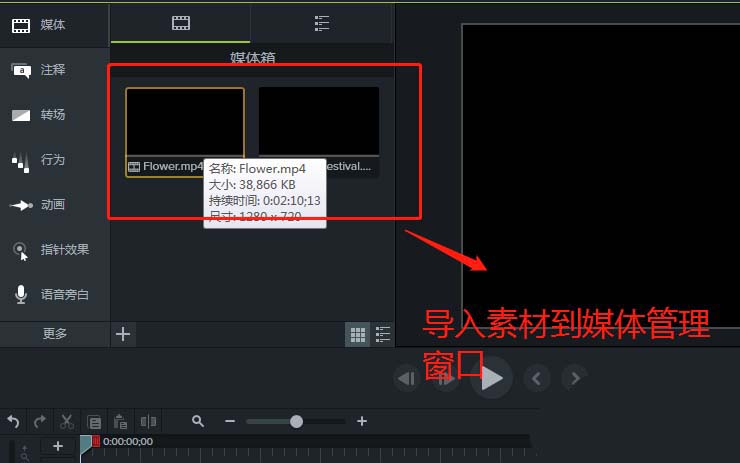 2、选择执行导入中的媒体之后,就会弹出打开窗口,通过打开这个窗口可以选择你要编辑的视频素材媒体并打开,然后在Camtasia 9媒体窗口中就可以看到视频素材了。