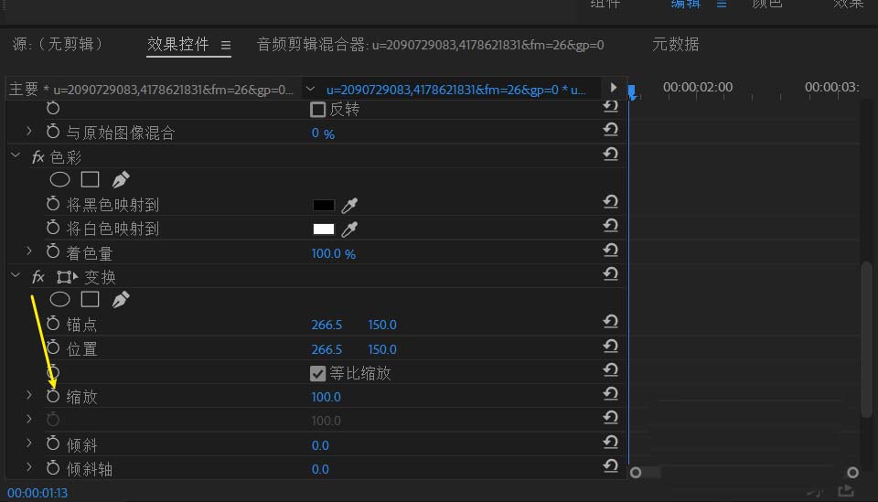 6、找到缩放,勾上关键帧,播放到这一段快要结束