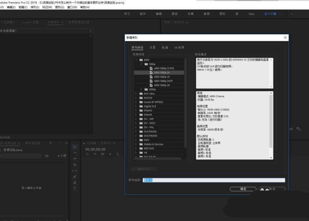 1、找到安装的Premiere软件,新建一个PR剪辑项目,在来创建一个序列,选择一个预设序列。
